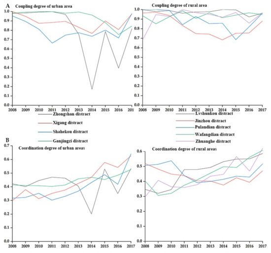 Note that the decline in the coupling degree is significantly higher among urban areas than rural areas. Among urban districts, the highest negative growths were found in Zhongshan District and Ganjingzi District at more than 10%, while among rural areas, the highest rate was in Jinzhou District at 8.71%. We also found that both urban and rural areas experienced long moderate coordination (Figure 4A). Except for Zhongshan District, with an unstable movement in coordination degree, most urban areas had a generally stable transition from the moderate coordination stage towards the high coordination stage. The overall coordination degree in Lushunkou District and Wafangdian City indicates a steady growth trend in rural areas. Lushunkou District (2008–2013) achieved a high level of coordinated development for population and medical services in only six years, significantly less than their urban counterparts. We also found that only Jinzhou District (−9.17%) showed negative growth in the coordination degree for population and medical services from 2008 to 2017 (Figure 4B). The highest growth rate among rural areas reached 109.31%, much higher than in urban areas at 83.66%.