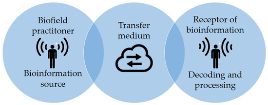 The mentioned complementary and alternative medicine (CAM) modalities see the human being as a holistic living system, exchanging energy and information with the environment. These CAM practices integrate the concept of “vital force” as the primary driving mechanism in health, pathogenesis, and healing. This “vital force” is often named as, for example, “Qi”, “Ki”, or “Prana” in Chinese, Japanese, and Hindu cultures. In a medical context, “Qi” can be described as a (neuro-)vegetative functional capacity of a tissue or an organ, which, in the case of TCM, is therapeutically influenced by reflex points in the body. However, some think that it might further be part of an innate biologic field of the body, in which bioinformation carried by tiny energy signals may trigger changes in molecular structures [13,14,15,16]. This sophisticated, dynamic, weak energy field might be involved in maintaining the whole organism’s integrity, regulating physiological and biochemical responses, and acting on development, healing, and regeneration [17,18]. Figure 1 illustrates the cybernetics of a hypothetical bioinformation transport mechanism established during a non-contact biofield intervention. In this system, the transfer medium might be understood as the medium carrying the signal generated by the practitioner, and the receptor is the patient receiving the treatment.