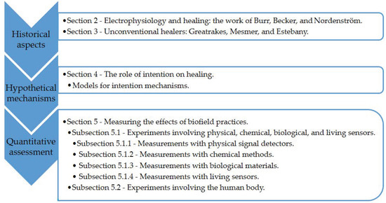Covering the three main topics presented in Figure 2, the main goal of this narrative review is to provide an easy to consult partial overview of the history, theory and findings of quantitative research strategies exploring non-contact biofield-based practices. This work also aims to stimulate the reader’s mind with the raised hypotheses, catalyzing further research on the subject to confirm or deny the reported outcomes.