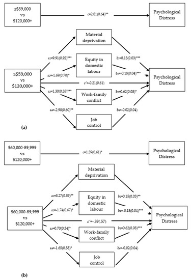 Results of multiple mediation analysis examining effects of household income on distress through material deprivation, equity, work–family conflict, and job control (n = 512).1 (a) Contrast between women in the ≤CAD 59,000 income group and those in the CAD120,000+ category; (b) Contrast between women in the CAD 60,000– CAD89,900 income group and those in the CAD 120,000+ category. 1 Adjusted for mothers’ age and paid work hours; * p < 0.05, ** p < 0.01, *** p < 0.001.