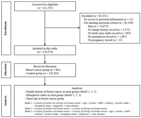 This cohort study relied on data from the KoGES from 2001 through 2013. A detailed description of these data is provided in a previous study [20]. A total of 211,725 participants were screened. Of these, we excluded men (n = 74,873) and participants who had no family history records (n = 5272) or records of body mass index (BMI) (n = 685), menopause (n = 1487), or pregnancy (n = 22) (Figure 1). Then, a total of 129,374 women were evaluated. Survey participants ranged from 40 to 91 years of age. Cancer incidence was identified by the Korea Central Cancer Registry. They were divided into two groups of participants, those with and without breast cancer.