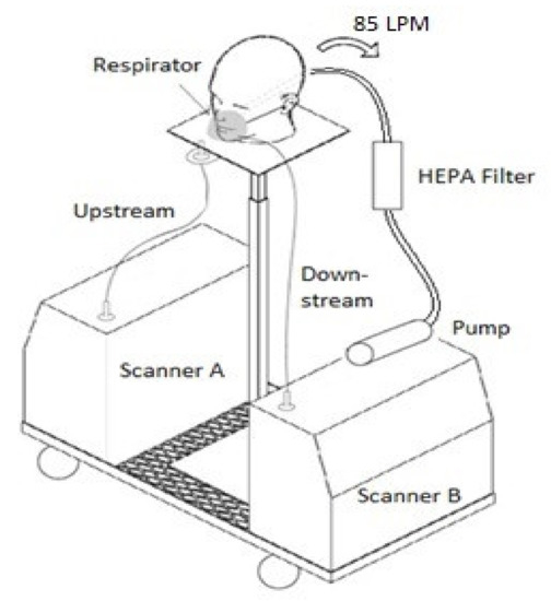 The setup was used in construction sites to simulate a construction worker and their exposure to ultrafine particles. A schematic diagram for the respirator testing setup is displayed in Figure 1. It is important to note that two NanoScan SMPS 3910s were used simultaneously in the data collection process. One machine measured the unfiltered, upstream airflow outside of the respirator. The other machine measured the filtered, downstream airflow inside of the respirator simultaneously. Airflow was created by an 85 L/min air pump, simulating the airflow pulling a similar amount of air into the respirator to that drawn by a human while breathing normally. According to the National Institute for Occupational Safety and Health (US NIOSH) N95 Filtering Facepiece Respirator (FFR) certification method, an N95 FFR sealed onto a plate should be tested against the airflow of 85 L/min [30]. Therefore, we have considered this airflow in our experimental setup. The setup was designed to be portable so that it could be transported it to different spots within a location and moved from one location to another. Therefore, a utility cart was developed with a built-in stand that held the two NanoScan machines and the manikin heads with adjustable heights.