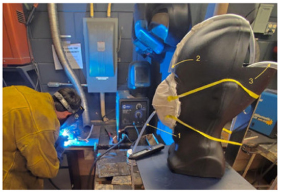 In Figure 2, an image of the actual setup in a welding location is displayed. The three sampling probes have been numbered to explain their functions. Probe 1 directed filtered airflow from behind the respirator into NanoScan Scanner B. Probe 2 directed unfiltered airflow from directly in front of the respirator into NanoScan Scanner A. Finally, Hose 3 traveled through the nose and from the back of the head and connected to a vacuum pump, simulating the workings of the lungs pulling in air from inside the respirator. The pump drew air at a consistent rate of 85 L/min, which simulates normal human breathing conditions in work environments.