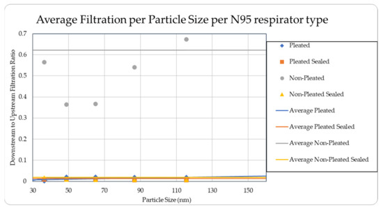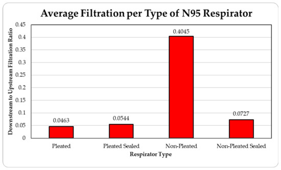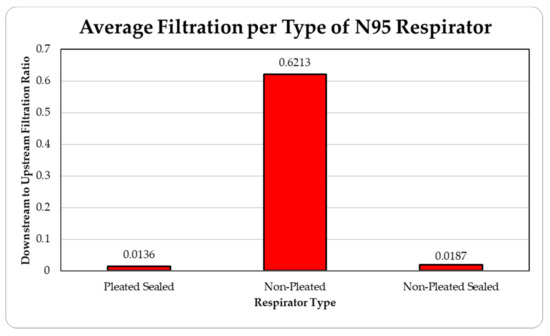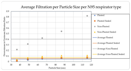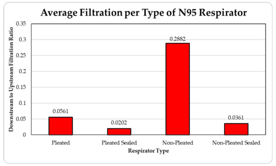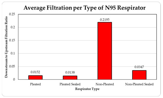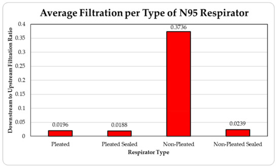 There are quite a few parameters that can affect the effectiveness of filtration by the facepiece, such as size of the particle, electrostatic attractions, properties of the fibers used in the respirator and particles, airflow patterns through the facepiece, thermal rebound, relative humidity, loading time, and filter chemical composition [31,32]. The current research only investigates two of these parameters, particle sources and particle size. However, considering other uncertainties, the results are quite consistent and exhibit a clear trend. The current results seem to be in general agreement with the recent results published in the literature, where percentage penetrations were found to be within 6% in all the cases under study covering the time span from 2000 to 2016 [27]. Future research will involve the effects due to the change in some of the parameters, such as different brands of commercially available pleated and unpleated facepieces.