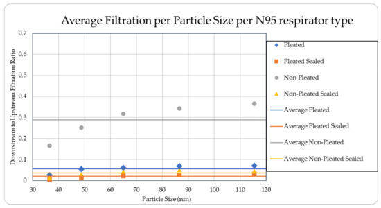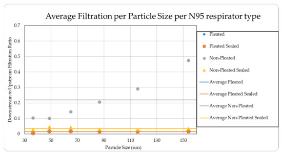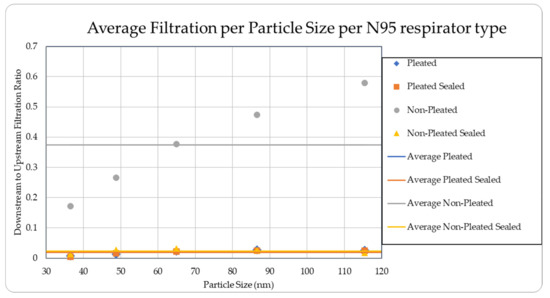 The level of concentration of particles over the size of 150 nm was low due to many zero values which prevented drawing any statistically significant inference, and hence were ignored in the result section. These observations were made for all three site locations. Since the ambient upstream nanoparticle concentration is constantly changing due to the randomness of nanoparticle movements and external influences, no trial experienced identical ambient nanoparticle concentrations. Due to this, trials were performed with two nanoparticle scanning devices, measuring ambient and filtered airflows simultaneously. This enables the evaluation of appropriate filtration rates of the facemasks without the influence from fluctuating ambient conditions. To provide a sense of the nanoparticle exposure in different working environments, average concentrations are provided in Table 1, Table 2, Table 3, Table 4 and Table 5. The results are also graphically presented in Figure 5, Figure 6, Figure 7, Figure 8, Figure 9, Figure 10, Figure 11, Figure 12, Figure 13 and Figure 14. Figure 5, Figure 7, Figure 9, Figure 11, and Figure 13 show the average filtration rates at different particle generation sources and locations for various filtering facepieces (pleated or non-pleated) and conditions (sealed or unsealed). Figure 6, Figure 8, Figure 10, Figure 12, and Figure 14 show corresponding details concerning the demographic of the particle sizes.