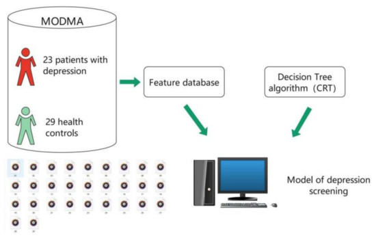 The principle of machine learning to identify depression is to memorize and calculate the comprehensive characteristics of depressive patients and non-depressive patients through machine learning program, and generate a model. The brief principle is shown in Figure 1. The 29 health controls in Figure 1 refer to the sample of “non-depressive” speakers. The CRT in Figure 1 refers to the classification and regression tree.