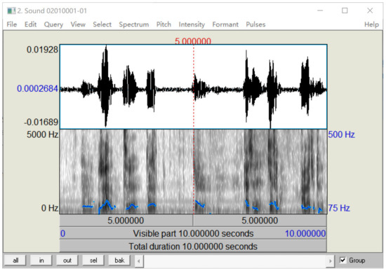 Praat is a famous software for speech processing. Because the features used in machine learning are digital features, it is not easy to be intuitively understood. Therefore, Praat software is used to visualize the features of a voice sample, which is convenient for preliminary observation. The real calculation of digital features needs a computer algorithm to realize, because the features are various and complex. Some features were visualized, as shown in Figure 2, including the waveform of sound, spectrum and pitch in the software menu. The waveform was easy to observe. The image below the waveform showed spectrum, and the blue curve on the image showed pitch. Here, the Praat diagram shows that voice features can be extracted and visualized.