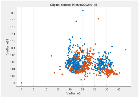 V3 and V69 were two of the most important features after calculating the importance of features in the interview database decision tree model. V3 was the first dimensional voice feature in the database, and V69 was the 67th dimensional voice feature. The feature scatter diagram of V3 and v69 is shown in Figure 3. It can be seen that the distribution of features had obvious rules, which was easy to distinguish by algorithm. The abscissa VarName3 represents V3. The vertical coordinate VarName69 represents V69.