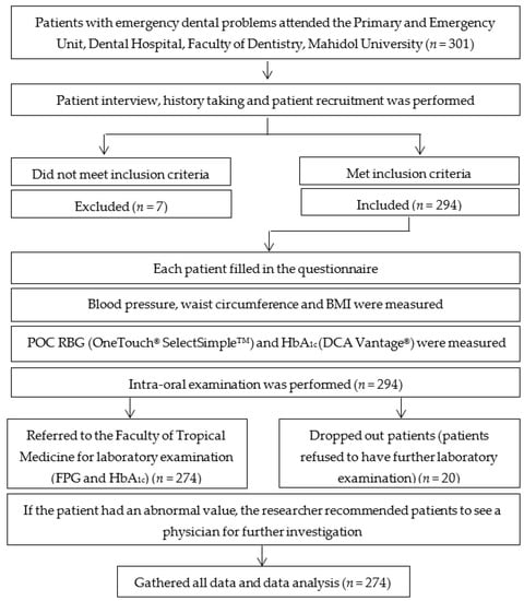 - Tantipoj, C.; Sakoolnamarka, S.S.; Supa-amornkul, S.; Lohsoonthorn, V.; Deerochanawong, C.; Khovidhunkit, S.P.; Hiransuthikul, N. Screening for Type 2 Diabetes Mellitus and Prediabetes Using Point-of-Care Testing for Hba1c among Thai Dental Patients. Southeast. Asian J. Trop. Med. Public Health 2017, 48, 455–465. [Google Scholar]