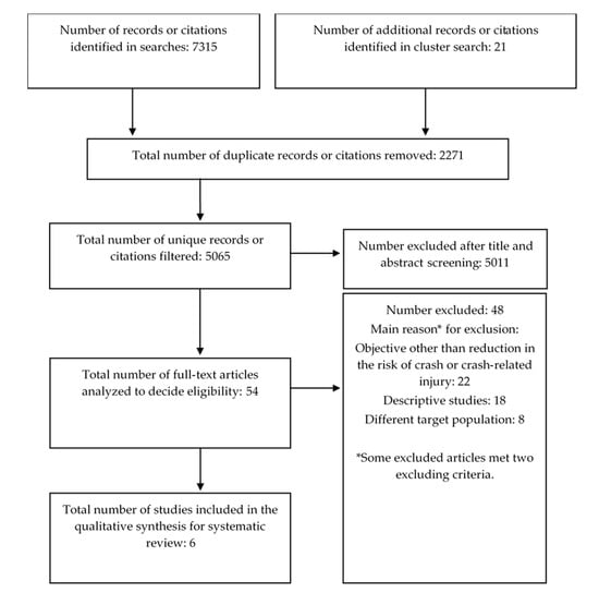 However, novel technologies and advances in traffic safety in recent years have led to declines in road crash rates, and as a result, some countries or regions within countries have opted to abolish this legal requirement [7,8]. According to reports by the National Highway Traffic Safety Administration in the USA, the risk of road crashes associated with driving a vehicle manufactured before 2000 is 71% higher than for vehicles manufactured in 2010 and later [9]. This finding, along with similar data, constitutes the main argument supporting economic subsidies intended to lower the mean age of vehicles on the road, instead of building, maintaining, and operating specialized VTI centers in those countries with VTI policies in effect [8]. Previous studies (none of which were systematic reviews) on this issue were inconclusive regarding the usefulness of VTI in reducing road crashes. The article by Jarosinski [4] noted the problem of underestimating the effects of vehicle technical defects in the causal chain of road crashes—a consequence of the fact that most published studies were based on registries maintained by police agencies. It was noted that officers at the scene lacked sufficient resources to record information on all factors that might have caused the crash, particularly those attributable to technical defects in the vehicles involved. According to Jarosinski, this accounted for the differences between the findings of studies on the usefulness of VTI. The review by Rechnitzer et al. [2] concluded that studies published up to the time their review was written have evident methodological shortcomings that rendered them unable to evaluate the relationship between VTI and automobile defects rigorously. These authors admitted that most such studies were rather old and that the characteristics of vehicles on the road had changed substantially in the meantime, as shown by the increase in warranty periods offered by car manufacturers.