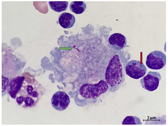 Rare macrophage with intracytoplasmic bacteria (green arrow). Note the lymphocytic pleocytosis in the background, including lymphocytes with irregular nuclear contours. Some lymphocytes contained intracytoplasmic granules (red arrow) (Wright Giemsa CSF sample, original magnification 1000×).