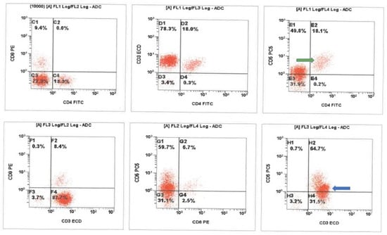 Cerebrospinal fluid (CSF) flow cytometric immunophenotyping revealed a background population of presumed alpha-beta T-cells with typical CD5 expression (green arrow) and a prominent CD4/CD8 negative T-cell population with decreased CD5 expression. The presumed gamma delta T-cells (blue arrow) show brighter CD3 expression as compared to the background presumed alpha-beta population. ADC-analogue to digital converter, FITC-fluorescein isothiocyanate, ECD-energy coupled dye (phycoerythrin-Texas Red conjugate).