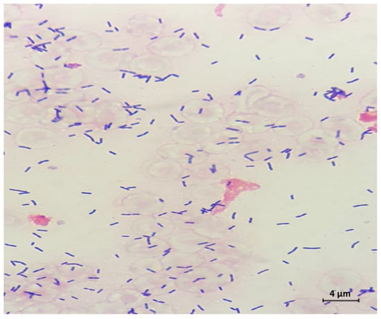Cerebrospinal fluid (CSF) Gram stain revealed Gram positive rods, and culture later confirmed Listeria monocytogenes (original magnification 1000×).