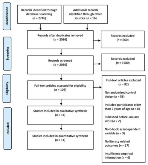 A total of 14 studies met the inclusion criteria, and throughout these studies, nine conditions compared e-books to print books, ten conditions compared enhanced e-books to non-enhanced e-books, and seven conditions compared e-books to the regular literacy curriculum.