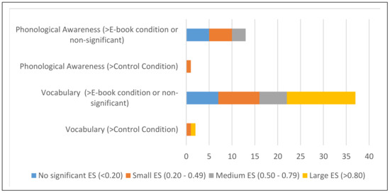 The frequency of non-significant, small, medium, and large ES would be reported in each of the three studied conditions and on each literacy measure (see Figure 2 for a summary of the frequency of different ES in vocabulary and phonological awareness in the e-book and control conditions).