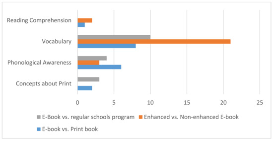 Six studies compared e-books with the regular school program in seven different conditions and a total of 17 reported outcomes (see Table 3). Three of these outcomes were reported on concepts about print, one of them with a negligible size; one with a medium size, and one with a large size. Four outcomes were reported on phonological awareness skills, one of them non-significant and three of them with medium size effects ranging from 0.52 to 0.54 in favor of the e-book condition. One of the conditions that favored the learning of phonological awareness skills showed children, when they clicked on a word, a large colorful frame displaying its phonetic segments in enlarged letters on the computer screen [19,51]. Studies reported 10 outcomes in vocabulary; eight of them had large effect sizes, in favor of the e-book. Conditions that favored the vocabulary outcomes were, for example, children listening to the audio of the story and engaged independently with the story activities, following verbal instructions that were part of the e-book [21], or children independently reading the static e-book versus playing computer games [48]. One outcome was in favor of the e-book condition with a medium size effect, and one non-significant outcome was reported for the PPVT test [49].