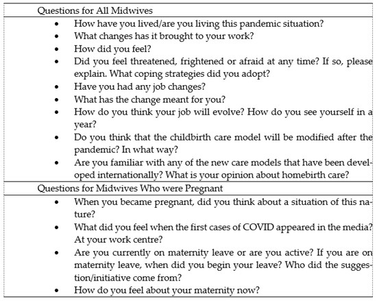 Interviews were held with active midwives. Some theoretical selection criteria were established, and these were used to cover the largest possible number of profiles of midwives. The common inclusion criterion was that they had to have been on the healthcare frontline during the first months of the pandemic, and we also sought variability in terms of the work center (hospital, primary care or homebirth care), age variability (29 to 50 years old), and we also looked to include midwives who had taken ill with COVID-19 as a result of becoming infected through their professional activity. We also included midwives who were pregnant at the start of the pandemic so that they could express their concerns as future mothers in addition to their professional viewpoint. Accordingly, interviews were held with midwives with the following profiles: