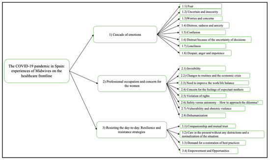 After analyzing the transcriptions, various aspects emerged in relation to the experiences and expectations of the midwives who were interviewed. Some aspects were based on subjectivity: the emotions they felt. An event as disruptive as the COVID-19 pandemic has several effects at a mental and emotional level. During the interviews, the midwives told the researchers about their emotions and experiences during the first months of the pandemic. In addition to personal and family aspects, the midwives had to carry out their work on the front line, and accordingly they had a responsibility to look after and accompany women who were pregnant or in childbirth. In Spain, midwives must first qualify as nurses before specializing, and this professional nursing qualification meant that some hospitals transferred them to look after COVID patients in general hospital wards. The midwives felt a conflict between their personal feelings and their sense of professional duty. The case of midwives who were pregnant at the start of the pandemic is also worth mentioning here, as they had to deal with the risk of infection, the doubts they had as to whether they should request leave from work and the frustration that stemmed from the feelings about pregnancy and childbirth that they had imagined before the pandemic. Given the important difficulties of the moment, the majority of the interviewed midwives developed resistance and resilience strategies, and these can be observed in the analysis.