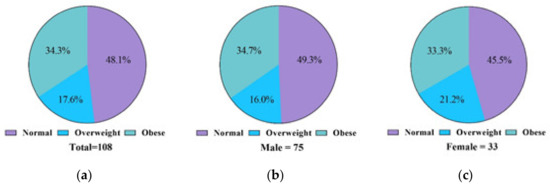 Percentages of Koreans in this study with intellectual disabilities who have a normal weight, are overweight, and obese: (a) percentage of overweight and obese (total subjects (N = 108)); (b) percentage of overweight and obese male subjects (n = 75); (c) percentage of overweight and obese female subjects (n = 33).