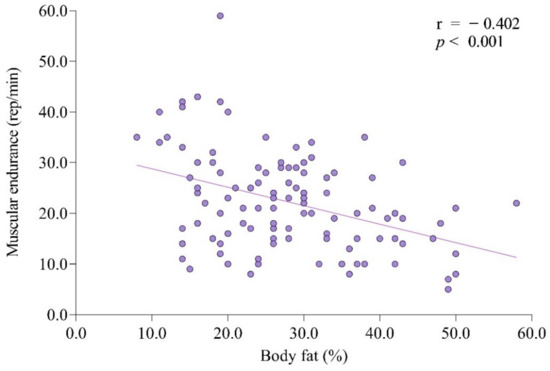 The relationship between body fat and muscular endurance (sit-ups) among Korean participants with intellectual disability. Body fat percentage is negatively correlated with sit-ups (r = −0.402, p < 0.001).