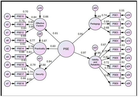 The aforesaid model showcases the perception of students towards e-exams, the principal latent variable, measured by its five sub-constructs: pedagogy, validity and reliability, affective factors, practicality, and security. Pedagogy, the first sub-construct, is measured via three statements (PSE1, PSE2, and PSE3) expressed by rectangles, for they are observed variables. Validity and reliability, the second sub-construct, is measured via six items coded as PSE4, PSE5, PSE6, PSE7, PSE8, and PSE9. Affective factors, the third sub-construct, is examined by three items coded as PSE10, PSE11, and PSE12. Practicality, the fourth sub-construct, measured via three statements coded as PSE13, PSE14, and PSE15. Security, the fifth and final sub-construct, is analyzed via three items coded as PSE16, PSE17, and PSE18.