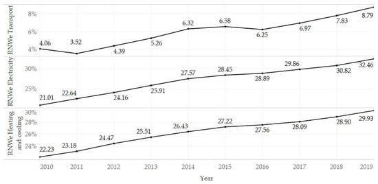 The share of energy from renewable sources in total energy consumption (RNWe) appeared in the classification of three sectors: (i) transport (RNWe TSP), (ii) electricity (RNWe ELC), and (iii) heating and cooling (RNWe H&C). This environmental indicator was presented as a percentage of renewable energy sources from total consumption, while the higher the value, the higher the consumption of renewable sources.