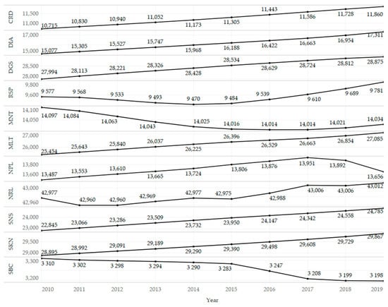 Figure 1 shows the development of the share of energy from renewable sources, and an upward trend is evident. The year-on-year changes were slightly unstable in the transport sector compared to the electricity and heating and cooling sectors, where the growth rate was relatively stable. Figure 2 presents the development of the prevalence of diseases classified into selected diagnosis groups, and an upward trend could be observed in most cases. This can be explained by population growth, increasing life expectancy, improving diagnostic methods in health care, but also by a deteriorating environment, when the use of renewable energy sources needs to be considered. On the other hand, a declining trend was observed for mental disorders (MNT) and substance use disorders (SBC). An interesting case was the group of neoplasms (NPL), in which it was possible to observe a break in the growing trend in 2017 and then a relatively strong decline.