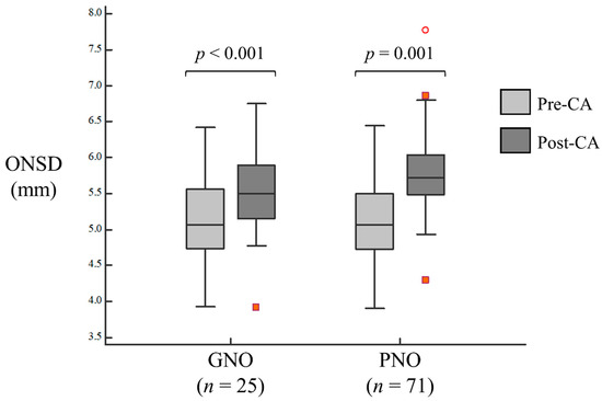 In both groups, the post-CA ONSD was significantly higher than the pre-CA ONSD (Figure 2). The pre-CA ONSD and post-CA ONSD were 5.06 and 5.50 mm, respectively, (p < 0.001) in the GNO group, and 5.07 and 5.72 mm, respectively, (p = 0.001) in the PNO group (Supplemental Table S1).