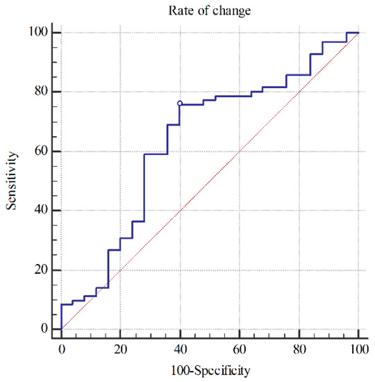 The AUC for predicting PNO was 0.64 (95% CI = 0.53–0.73; p = 0.04) in the ROC curve for the rate of ONSD change (Figure 3). Patients with a rate of ONSD change >27.2% had PNO with a specificity and PPV of 100%. GNO could be predicted using a cut-off value of ≤5.83% in the ROC curve for the rate of ONSD change, with a sensitivity and specificity of 60.0 and 76.06%, respectively; the PPV and NPV were 46.9 and 84.4%, respectively (Table 4).