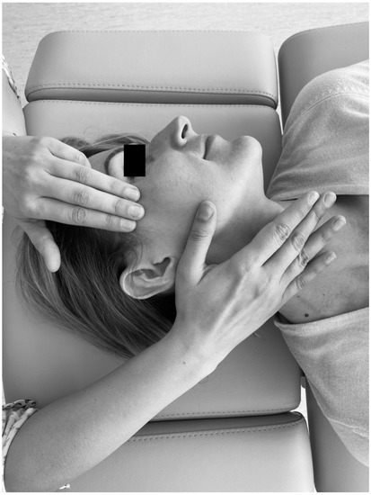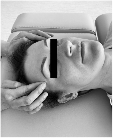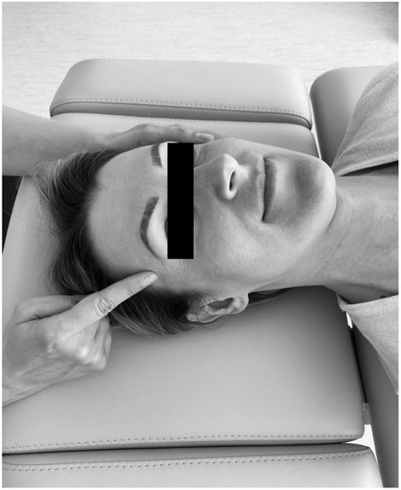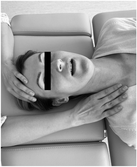 The trigger point therapy consisted in initiating a slow increase of pressure on an active trigger point until reaching a tissue barrier [31]. The physiotherapist used one finger to contact the trigger point and an entire hand for contralateral head stabilization (Figure 2). For bilateral active trigger points, simultaneous treatment was provided with both hands (Figure 3). Soft tissue mobilization was started on the anterior edge of the muscle and proceeded towards its posterior margin. The therapy focused on the muscle areas that required to be released. The physiotherapist lengthened the muscle as far as the patient’s comfort allowed. Next, the specialist applied gentle, gradually increasing pressure on the trigger point until the finger reached a significant increase in tissue resistance (the barrier was engaged). It had been settled with patients that they might experience some discomfort, but pain was not acceptable [31]. This pressure was maintained (but not intensified) until the therapist felt the release of the tissue under the touching finger. Then the pressure was increased again. The extent of soft tissue laxity was adjusted accordingly to obtain a new barrier (the finger following the releasing tissue). Next, slight pressure was employed again to release more muscle tension under the touching finger. At that stage, it was considered acceptable to change the direction of pressure to achieve a better effect [31]. The technique of releasing pressure of trigger points involves adjusting to particular muscles of every individual patients and can be repeated for any taut muscle band [31]. The procedure was performed repeatedly until sensitivity and/or tension of the muscles decreased, or for 1.5 min, whichever occurred first.