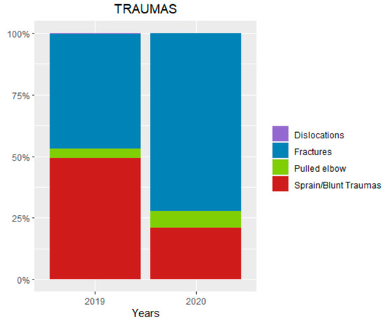 Pediatric traumas pattern during the lockdown (10 March–4 May of 2019) compared with the same period of 2019.