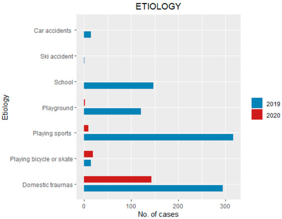 In 2020, 143 patients (82.6%) had domestic traumas, nine patients (10.9%) traumas on the street (riding bikes or skates), nine patients (5.2%) playing sports and two (1.1%) at the playground (Figure 2).