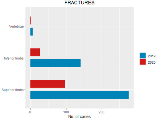 Among 125 fractures occurring in 2020, 97 (77.6%) involved superior limbs, 27 (21.6%) inferior limbs and one (0.8%) vertebrae (Figure 3). Among 424 fractures that occurred in the same period of 2019, 276 (65%) were superior limbs fractures, 141 (33.2%) were inferior limbs fractures, and 7 (1.6%) were vertebral fractures (Table 2, Figure 3).