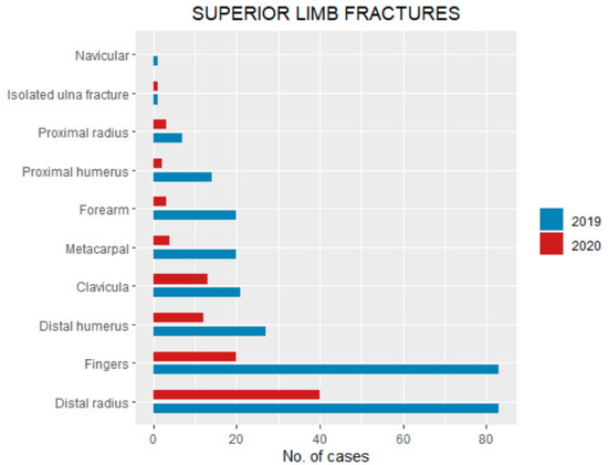 Concerning superior limb fractures in 2020, the bones involved were: 40 (32% of total fractures) distal radius, 20 (16%) fingers, 13 (10.4%) clavicula, 12 (9.6%) distal humerus, four (3.2%) metacarpals, three (2.4%) forearm, three (2.4%) proximal radius, one (0.8%) proximal humerus and one (0.8%) isolated ulna fracture (Figure 4). By contrast, in 2019 superior limb bone fracture incidents were divided as follow: 83 (19.5% of total fractures) distal radius, 83 fingers (19.5%), 27 (6.3%) distal humerus, 21 (4.9%) clavicula, 20 (4.7%) forearm, 20 (4.7%) metacarpal, 10 (2.3%) proximal humerus, seven(1.6%) proximal radius, four (0.9%) isolated ulna, and one (0.2%) navicular (Table 2, Figure 4).