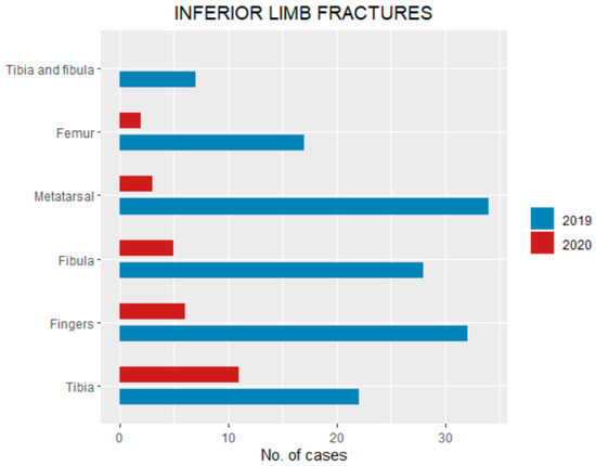 In 2020, among inferior limbs, the bones involved were: 11 tibia (8.8% of total fractures), six (4.8%) fingers, five (4%) fibula, three (2.4%) metatarsal and two (1.6%) femur (Figure 5). In 2019, the inferior limb bones involved were: 34 metatarsal (8% of total fractures), 32 (7.5%) fingers, 28 (6.6%) fibula, 22 (5.1%) tibia, 18 (4.2%) femur and seven (1.6%) tibia and fibula (Table 2, Figure 5).
