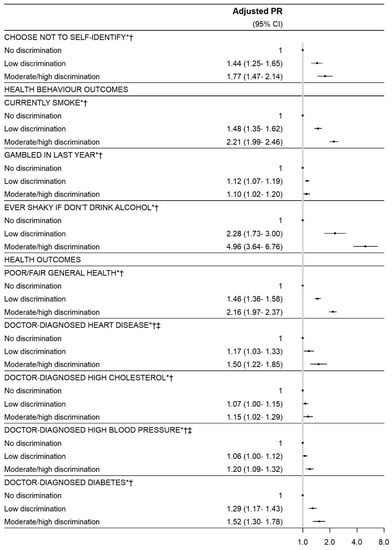 Relationship between experiences of everyday discrimination and wellbeing outcomes (n = up to 8100). The adjusted models are adjusted for age group, gender (male or female), and remoteness. Due to small numbers, participants identifying as another gender are excluded from all regression analyses as the fully-adjusted models are adjusted for gender. All models exclude participants missing the outcome of interest.* Indicates that the overall discrimination score variable is significant in the adjusted model, with the p-value for the Wald test < 0.05. † Indicates that the trend is significant in the adjusted model (when the discrimination score is included as a continuous variable, set to the mean total score for each discrimination category), with the p-value for trend <0.05. ‡ Indicates that the adjusted model for the outcome (heart disease, blood pressure) employs a collapsed age categorisation (16–65 years, ≥66 years) due to small cells. See Table S2 for numbers of participants, unadjusted PR, and crude outcome prevalences by exposure category.