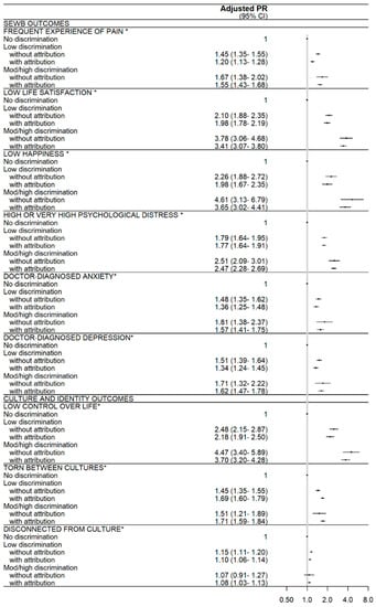 The overall pattern of association was similar when outcomes were examined in relation to the composite measure of discrimination experience and attribution (Figure 2; Table S3); while all variables were still significant, some individual coefficients were no longer significant, and the smaller numbers in exposure categories (particularly moderate-high discrimination without attribution) led to wider confidence intervals. In general, the strength of association was similar regardless of the attribution of Indigeneity; that is, confidence intervals surrounding coefficients overlapped for those experiencing low discrimination versus without attribution, and for those experiencing moderate/high discrimination versus without attribution. There were three exceptions, where the effect varied by attribution: the relationship of pain to low discrimination without attribution (PR = 1.45; 1.35, 1.55) was stronger than for low discrimination with attribution (PR = 1.20; 1.13, 1.28), the relationship of feeling torn between cultures to low discrimination with attribution (PR = 1.69; 1.60, 1.79) was stronger than for low discrimination without attribution (PR = 1.45; 1.35, 1.55), and the relationship of gambling to high discrimination with attribution (PR = 1.14; 1.05, 1.24) was in the opposite direction to that for high discrimination without attribution, where the PR was significantly less than 1 (PR = 0.71; 0.50, <1.00).