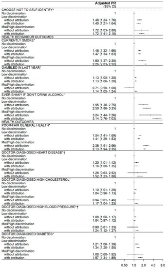 Relationship between experiences of everyday discrimination, with and without attribution to Indigeneity, and wellbeing outcomes (n = up to 8039). The adjusted models are adjusted for age group, gender (male or female), and remoteness. Due to small numbers, participants identifying as another gender are excluded from all regression analyses as the models are adjusted for gender. All models exclude participants missing the outcome of interest. * Indicates that the overall discrimination score variable is significant in the adjusted model, with the p-value for the Wald test <0.05. † Indicates that the adjusted model for the outcome (heart disease, blood pressure) employs a collapsed age categorisation (16–65 years, ≥66 years) due to small cells. See Table S3 for numbers of participants, unadjusted PR, and crude outcome prevalences by exposure category.