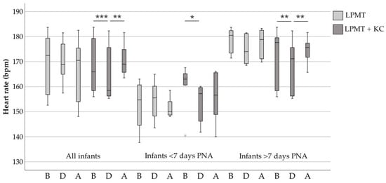 Heart rate before, during and after LPMT compared with combined interventions. The boxes represent the interquartile ranges and the whiskers represent the range of all infants. Grey stars indicate the outliers of this study. PNA, Postnatal age; LPMT, live-performed music therapy; KC, kangaroo care; Bpm, beats per minute; B, before therapy; D, during therapy; A, after therapy; *, p < 0.05; **, p ≤ 0.01; ***, p ≤ 0.001.
