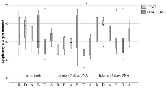 Respiratory rate before, during and after LPMT compared with combined interventions. The boxes represent the interquartile ranges and the whiskers represent the range of all infants. Grey points and stars indicate the outliers of this study. PNA, postnatal age; LPMT, live-performed music therapy; KC, kangaroo care; B, before therapy; D, during therapy; A, after therapy; *, p < 0.05.