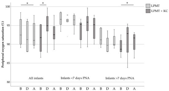 In Figure 3, we present the responses of all included infants compared with infants that received therapy before and after 7 days PNA. Oxygen saturation decreased statistically significantly after LPMT (median 94.0% before to median 92.7% after, p = 0.011). Regarding combined interventions, we observed an increase of oxygen saturation during therapy (median 91.4% before to median 94.5% during, p = 0.044). This oxygen saturation increase during LPMT combined with KC was significant in infants older than 7 days PNA (p = 0.033). Although not statistically significant, oxygen saturation levels of preterm infants seemed to slightly elevate during combined therapy and slightly drop during LPMT alone in both PNA groups.