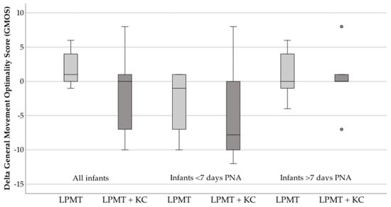 Strikingly, we found that infants reacted better to LPMT therapy after 7 days PNA when compared with receiving therapy before 7 days PNA. The mean delta GMOS of infants before 7 days PNA was primarily negative for both interventions, whereas for infants after 7 days PNA the delta was predominantly positive, indicating better neurological outcomes after 7 days PNA. The differences found between PNA groups are intriguing and warrant further analysis. Previous studies found that the GMA is a good indicator for brain functioning and short-term neurodevelopmental outcomes in very preterm infants [,,,,]. However, it has also been reported that detailed GMOS scoring may be inconsistent and influenced by many unknown factors during the first week after birth [,,,]. It may be that potential positive effects of LPMT during the first week on neurological functioning are concealed by this varying GMOS. Still, we also cannot rule out that LPMT is not apt for the tiny infant during the first days after birth, due to the transition from fetal to neonatal period, even if morbidities are not so severe. Then, perhaps we should postpone LPMT until 7 days after birth, at least until future studies have elucidated this further.