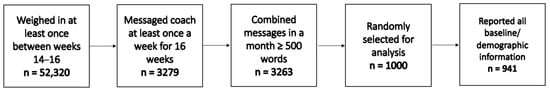 Ethical approval for this study was obtained from the Advarra IRB. As part of the approved consent process, all individuals provided informed consent at program sign-up that all their program data could be used for retrospective research. At that time, they were given the option to opt out. To be included in the study, individuals had to be between 18–65 years old, overweight or obese (defined according to federal standards as a body mass index ≥ 25), located in the United States, and signed up during May or June of 2020 [56]. These criteria were chosen to rule out potential confounders (e.g., cultural differences in emotion) and to ensure that all participants had received the full program as intended. In addition, as minimum thresholds for data analysis, participants had to have logged their weight at baseline and at least once any time during weeks 14–16, completed the 16 week program by the time of data collection, messaged the coach at least once a week, and written at least 500 combined words in their messages to the coach each month. Of the individuals who met these criteria, 1000 were randomly selected for the study. Of these 1000, 941 participants provided gender and height at baseline, which were used for BMI calculations, and were included in analyses (see Figure 1). Transcripts of messages to the coach, self-reported weight data, and engagement data for the 941 participants were extracted from Noom’s database (Noom, Inc., New York, NY, USA) and de-identified.