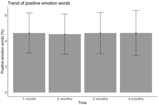 Therefore, this study extends numerous studies measuring emotional language over time to the domain of goal pursuit during weight loss. Specifically, we explore the emotion felt and expressed via emotional words during goal setting and striving conversations with a coach in a mobile weight loss program. Understanding how emotion words change while reflecting on goal progress, particularly when measured in real-time rather than by self-report after finishing the program, can help inform when individuals need extra support to cope with the emotions they are expressing and experiencing. Previous weight loss intervention studies have measured self-reported emotional changes over relatively broad time scales (e.g., 3 or more months [36,37,38,39]), but it is unclear how these patterns will manifest over shorter time spans, such as every month, with unobtrusively measured language. These studies have found that positive emotion increases and negative affect emotion decreases when measured only before and after the intervention. Based on this work, we hypothesize that in goal setting and striving conversations with a coach, positive emotion words will significantly increase over time throughout the program, and negative emotion words will significantly decrease over time throughout the program.