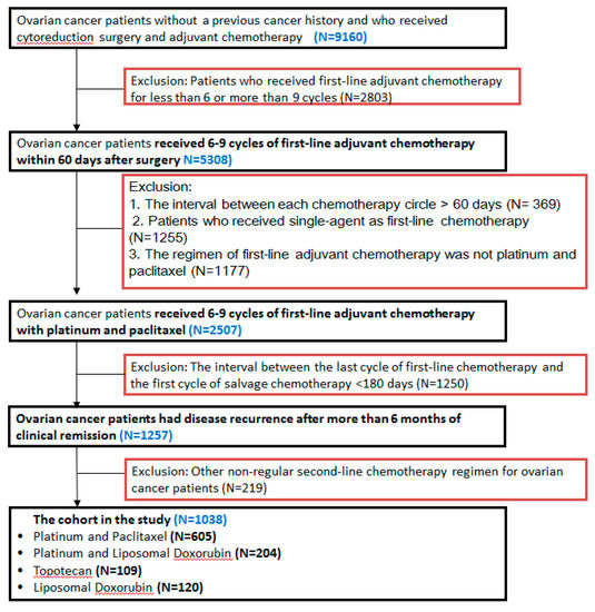 The patients in this study included advanced-stage EOC patients with disease progression more than 6 months after previous platinum-based chemotherapy. The patients who fulfilled the criteria were further identified from the catastrophic illness registry. Ovarian cancer patients who received gynecological surgery (staging or debulking surgery) between 1 January 2000 and 31 December 2011 were included in this study. To identify patients with advanced-stage ovarian cancer (stage III or IV), those who underwent frontline debulking surgery (standard surgery for stage III or IV) with adjuvant chemotherapy were recruited. The National Health Insurance (NHI) in Taiwan only reimburses platinum and paclitaxel for the frontline adjuvant chemotherapy of stage III or stage IV ovarian cancer. Thus those who received platinum-plus-paclitaxel-containing regimens reimbursed by the NHI followed by debulking surgery were cases of advanced-stage and thus included. The debulking operation included abdominal total hysterectomy, bilateral salpingo-oophorectomy, omentectomy, and retroperitoneal lymphadenectomy. The inclusion criteria were patients who received surgery for ovarian cancer during 2000–2011 and had no history of any other cancer type. The exclusion criteria were (1) first cycle of chemotherapy >60 days after surgery, (2) interval of each chemotherapy cycle >60 days, (3) less than six cycles of chemotherapy (considered incomplete treatment), (4) more than nine chemotherapy cycles (considered persistent disease), (5) single-agent used as first-line adjuvant chemotherapy, (6) adjuvant chemotherapy regimens other than platinum and paclitaxel, (7) interval between each cycle of adjuvant chemotherapy >60 days, and (8) interval between the last date of the last cycle of adjuvant chemotherapy and the first cycle of salvage chemotherapy <6 months (considered platinum resistance). The eligible patients in this study received six to nine cycles of platinum + paclitaxel chemotherapy within 60 days after surgery as adjuvant chemotherapy, and had >6 months of clinical remission before receiving salvage chemotherapy after disease relapse.