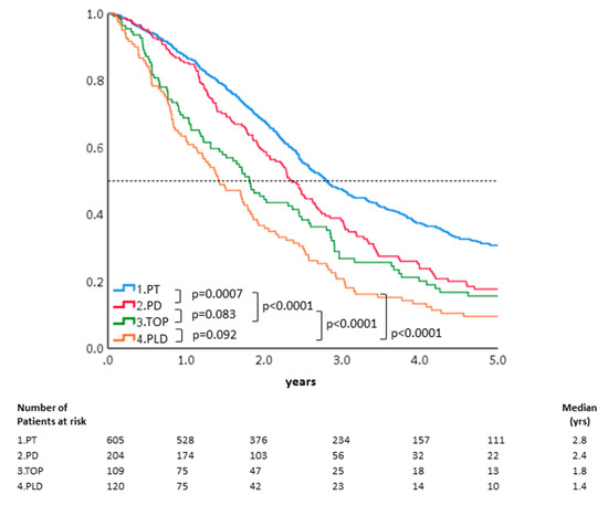 OS of the 1038 patients treated with different chemotherapeutic regimens. The estimated probability of five-year OS was 31% in the PT group, 18% in the PD group, 16% in the TOP group, and 10% in the PLD group. The PT group also showed better five-year OS compared with the PD group (p < 0.001, by log-rank test).