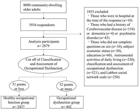 Figure 1 shows the participant flowchart. Inclusion criteria were (1) those who are 65–85 years, (2) those without any functional disability. We randomly selected 8000 participants from the basic resident register on 1 October 2019. A self-administered questionnaire was mailed to participants in November 2019. Responses were obtained from 3934 persons (recovery rate: 49.2%). The exclusion criteria were as follows: (1) Those who were in hospital at the time of the response, (2) Those who had a history of cerebrovascular disease, dementia, or psychiatric disorder, and (3) Those who submitted incomplete questionnaires. As a result, 2879 participants were included in the final analysis. All participants were informed of the study details and provided informed consent. This study protocol was approved by the Ethical Committee of the University of Tsukuba (Ref No. Tai 019-101).