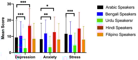 Average DASS-21 subscale scores by language speakers. * p < 0.05, ** p < 0.01, *** p < 0.001.