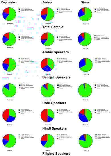The mean scores for the DASS-21 subscales in each group are shown in Figure 1. The results indicated that there were significant differences in mean scores for depression (F(4, 287) = 11.76, p < 0.0001), anxiety (F(4, 287) = 7.616, p < 0.0001), and stress (F(4, 287) = 8.214, p < 0.0001) among speakers of different languages. The post-hoc analysis found that Urdu speakers had significantly lower mean scores compared to Arabic speakers for all subscales (p < 0.05), while Hindi speakers had significantly higher mean scores compared to Arabic speakers for the depression and anxiety subscales (p < 0.0001, p = 0.0280). Figure 2 shows the prevalence and severity of each psychological disorder among the participants. The results showed that 39.39%, 43.84%, and 32.53% of the participants reported symptoms of depression, anxiety, and stress, respectively. Notably, Hindi speakers were more likely to report severe symptoms of depression, anxiety, and stress compared to the other groups. For instance, 41.86%, 48.84%, and 18.60% of Hindi speakers reported severe symptoms of depression, anxiety, and stress, respectively, while less than 7% of Urdu speakers reported severe symptoms for any of the DASS-21 subscales.
