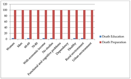 Generally, in the following figure (Figure 1), we can see the percentage of participants who have received an education for death and who describe the importance of receiving preparation for death. Only women, between 60 and 70 years of age, with no educational level and with an income who live in rural areas have received an education for death throughout their entire lives. However, all participants affirm the importance and necessity of receiving preparation for death.